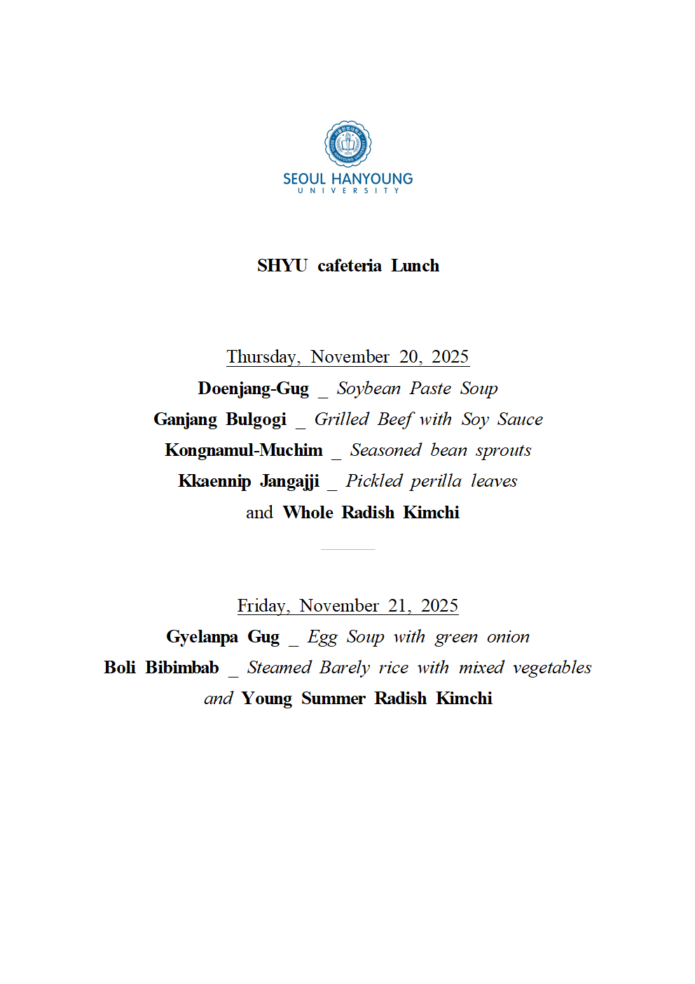 SHYU Lunch Menu, November 20-21