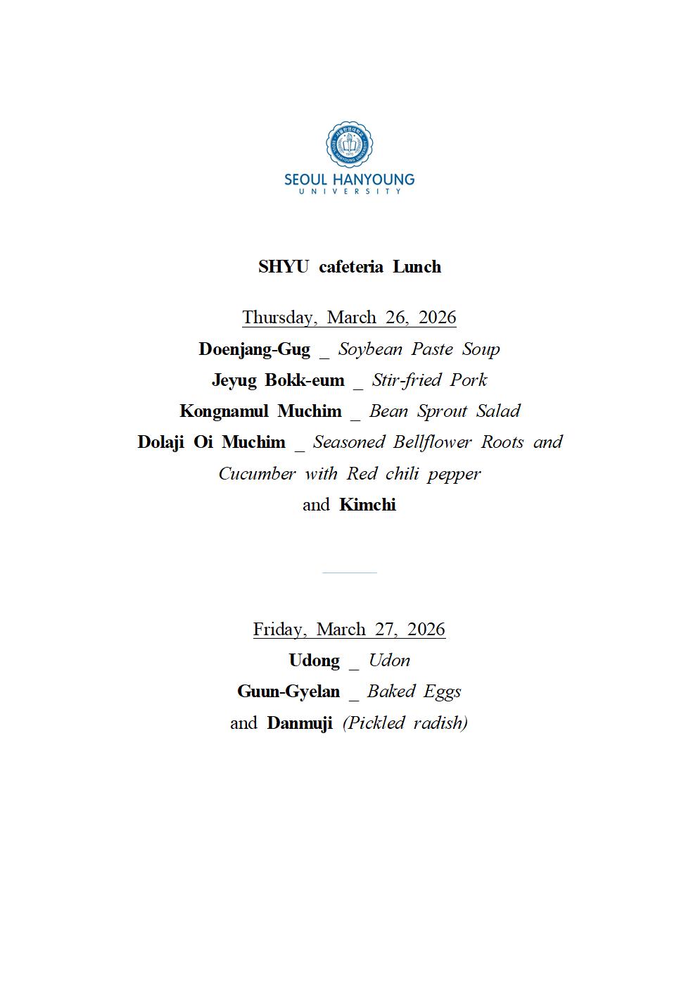 SHYU Lunch Menu, March 26-27