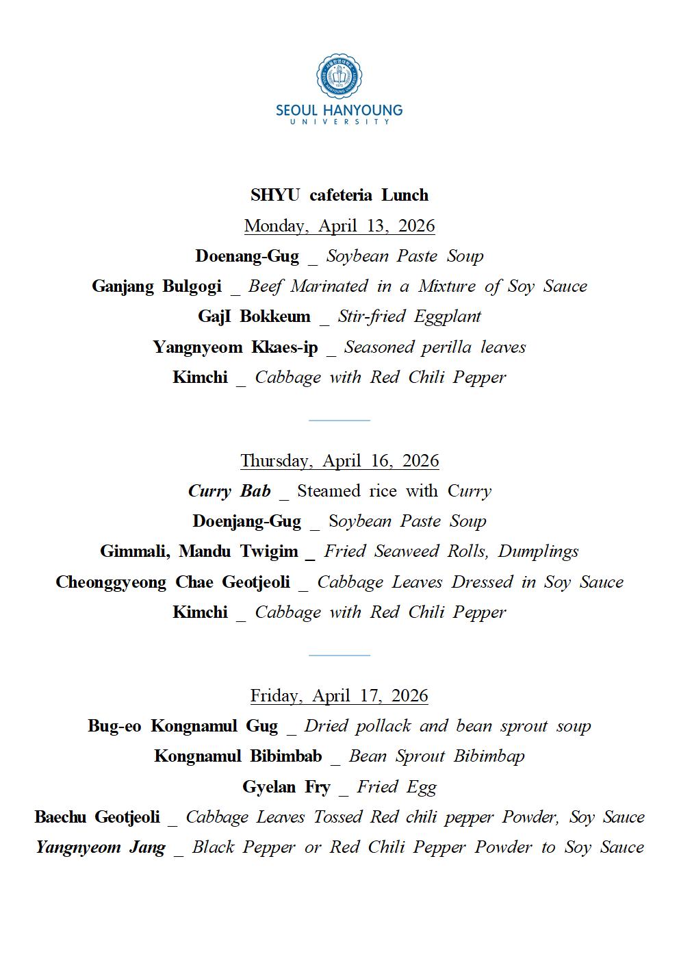 SHYU Lunch Menu, April 13, 16-17
