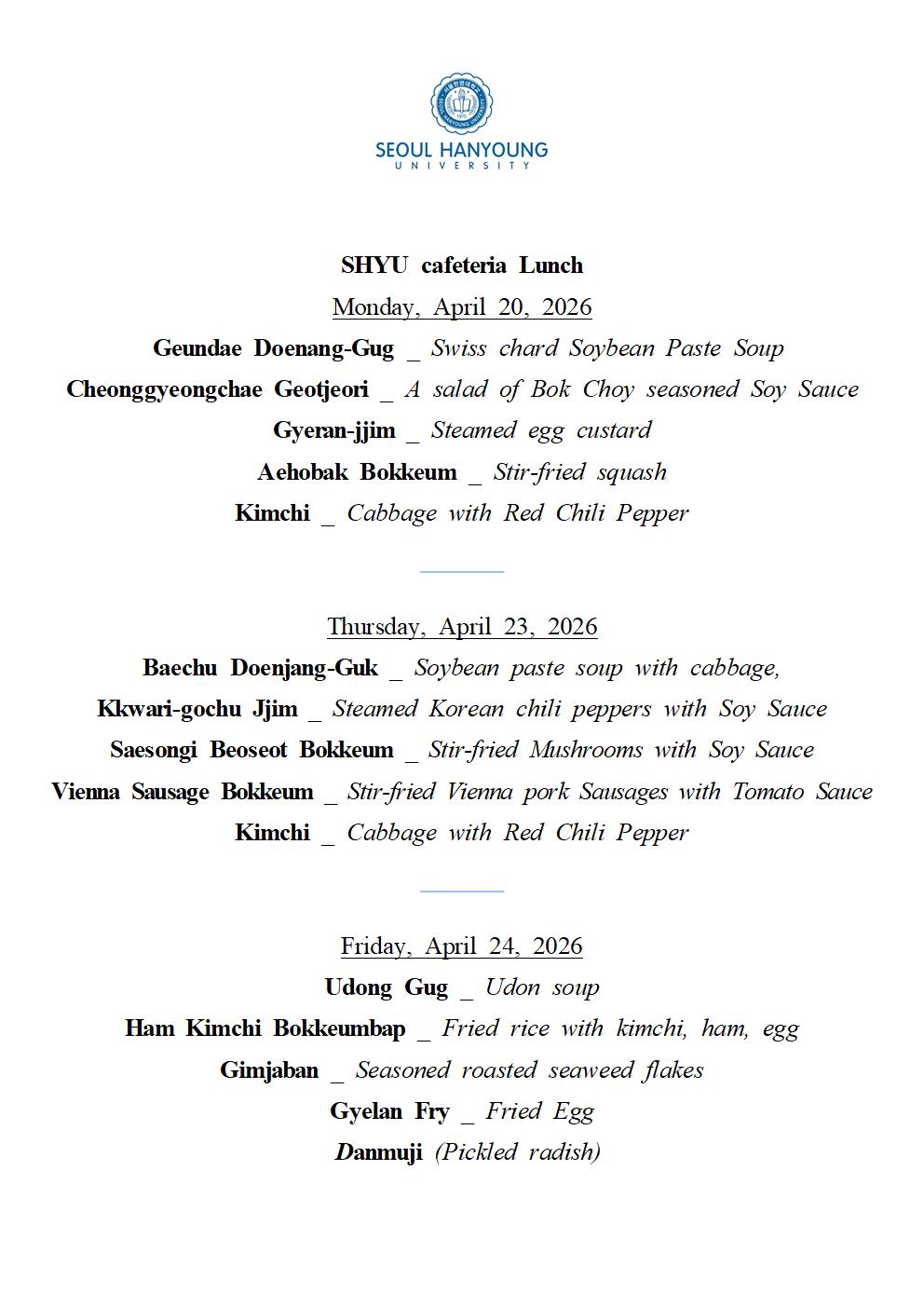 SHYU Lunch Menu, April 20, 23,24